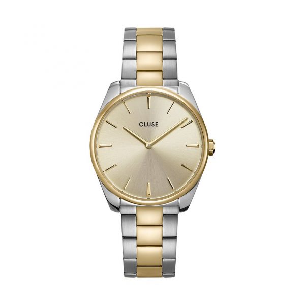 Mit Cluse entscheidest du dich für mehr als nur eine Uhr – du entscheidest dich für Stil und Haltung. Die in Amsterdam entworfenen Designs sind perfekt für alle, die die Schönheit im Einfachen finden und Wert auf hochwertige Materialien legen. Zeitlos schön, wie du! Die lässige Eleganz dieser Damenuhr wird besonders durch das Edelstahl-Gehäuse und das Edelstahl-Band geprägt. Sowohl das Gehäuse als auch das Armband der Cluse Féroce kommen in Bicolor daher, wozu das gelbgoldene Ziffernblatt harmonische Akzente setzt. Im Inneren tickt ein zuverlässiges Miyota-Quarzwerk. Die Orientierung auf dem Ziffernblatt wird durch die Markierungen erleichtert, was zur leichten Ablesbarkeit beiträgt. Das Mineralglas über dem Ziffernblatt bietet ausreichenden Schutz gegen die gewöhnlichen, äußeren Einflüsse im täglichen Leben. Dieser Zeitmesser ist mit einer Wasserdichtigkeit von 5 Bar ausgestattet, was bedeutet, dass er nicht nur Spritzwasser standhält, sondern auch einem wohltuenden Bad. Das Armband lässt sich durch die Kipp-Faltschließe leicht und sicher anlegen. Kurz gesagt: Die Cluse Féroce Damenuhr ist ein Statement für guten Geschmack – und ein zuverlässiger Begleiter im Alltag.