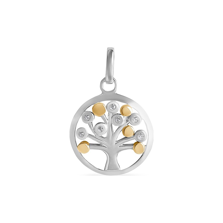 Außen ein Kreis aus Silber, innen ein kleiner Baum mit runden Blättern aus Gold und Zirkonia: Dieser Anhänger für die Halskette besticht mit einem traumhaft schönen Design. Mit den vergoldeten Elementen und den strahlenden Farbsteinen in Weiß tritt das Schmuckstück von FAVS als individuelles Highlight auf. Bicolor mit dem gewissen Etwas – dadurch wirkt der 925er Silber-Anhänger besonders interessant und detailverliebt.