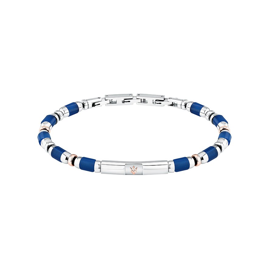 Für dieses Armband hat sich MASERATI kurzzeitig vom rechteckigen Design verabschiedet. Stattdessen sorgen abgerundete Glieder für einen modernen Look. Die Oberfläche des silbernen Edelstahls ist poliert – für einen spektakulären Glanz. Einen dynamischen Farbkontrast setzen die dunkelblauen Schmucksteine aus Achat. Wie für die Marke typisch ist das Accessoire mit exklusiven Details versehen: Die Verbindungselemente und der charakteristische Dreizack strahlen in warmem Rosé.