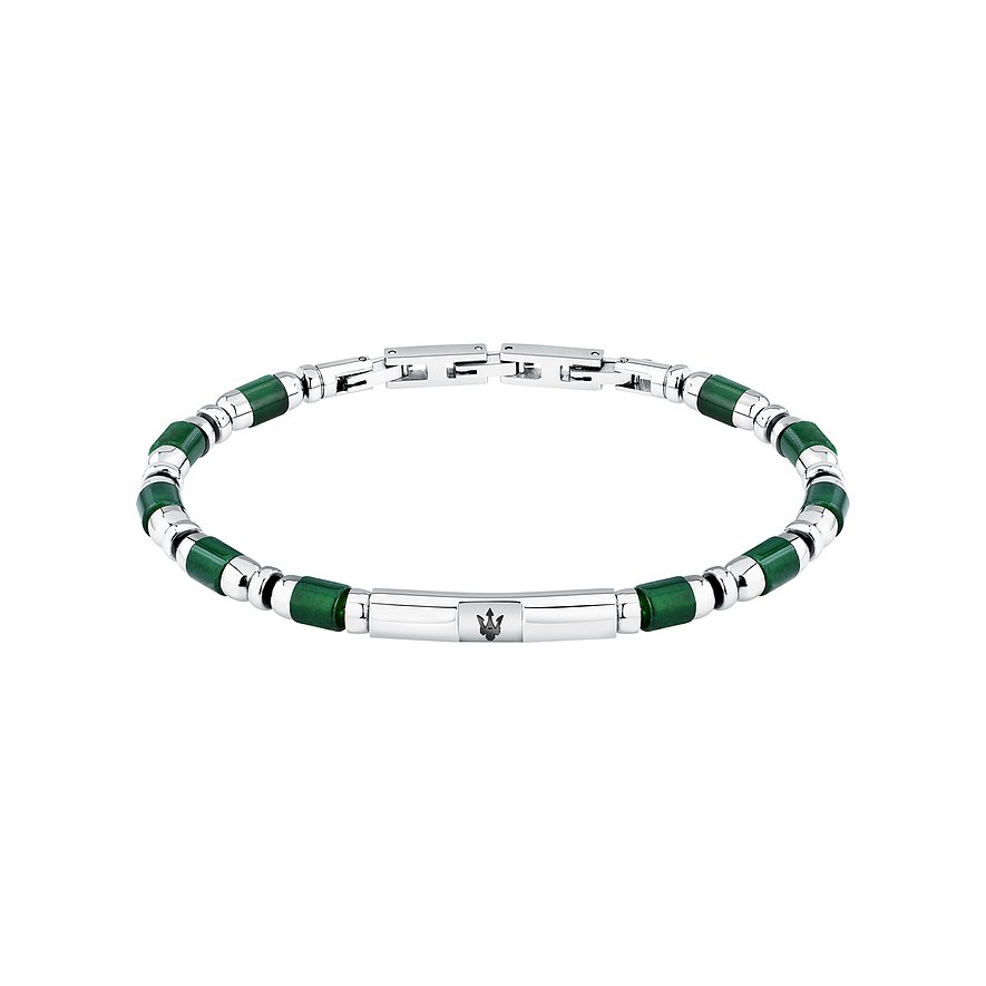 Lust auf etwas Neues? Dieses modische Armband von MASERATI bietet dir eine unkonventionelle Farbkombi. Abgerundete Glieder aus silbernem Edelstahl und tiefgrünem Achat reihen sich aneinander. Die glänzend polierte Oberfläche hebt den dynamischen Kontrast perfekt hervor. Auf dem mittleren Schmuckelement thront ein schwarzer Dreizack – das exklusive Symbol der Marke. Mit dem Klappverschluss kannst du das Accessoire schnell an- und wieder ablegen.