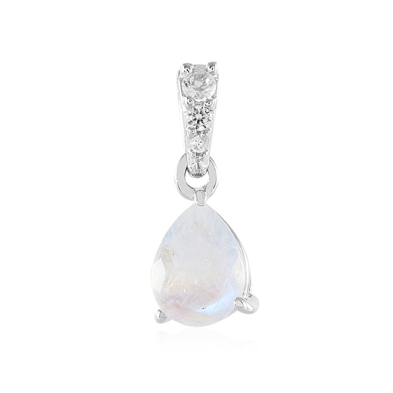 Regenbogen-Mondstein aus Indien, 1,074 ct – Tropfenschliff – ca. 8×6 mm, Zirkon aus Kambodscha, 0,067 ct – Rundschliff – ca. 2,3 mm, Zirkon aus Kambodscha, 0,032 ct – Rundschliff – ca. 1,8 mm, Zirkon aus Kambodscha, 0,013 ct – Rundschliff – ca. 1,2 mm, Zirkon aus Kambodscha, 0,01 ct – Rundschliff – ca. 1,1 mm, 925er Sterling Silber, platiniert – ca. 0,75 g, Gesamtkaratgewicht: 1,196 ct., Anhänger – 17×6 mm