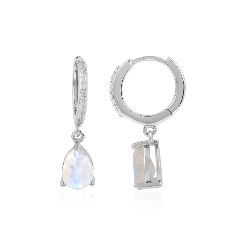 2 Regenbogen-Mondsteine aus Indien, 2,237 ct – Tropfenschliff – ca. 8×6 mm, 16 Zirkone aus Kambodscha, 0,148 ct – Rundschliff – ca. 1,1 mm, 925er Sterling Silber, platiniert – ca. 2,49 g, Gesamtkaratgewicht: 2,385 ct., Ohrringe – 25 mm