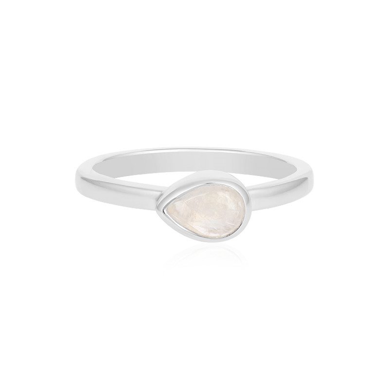 Regenbogen-Mondstein aus Indien, 0,528 ct – Tropfenförmiger Cabochon – ca. 6×4 mm, 925er Sterling Silber, platiniert – ca. 1,55 g, Gesamtkaratgewicht: 0,528 ct., Erhältlich in Größe 19, 21, Ring – 22×18 mm